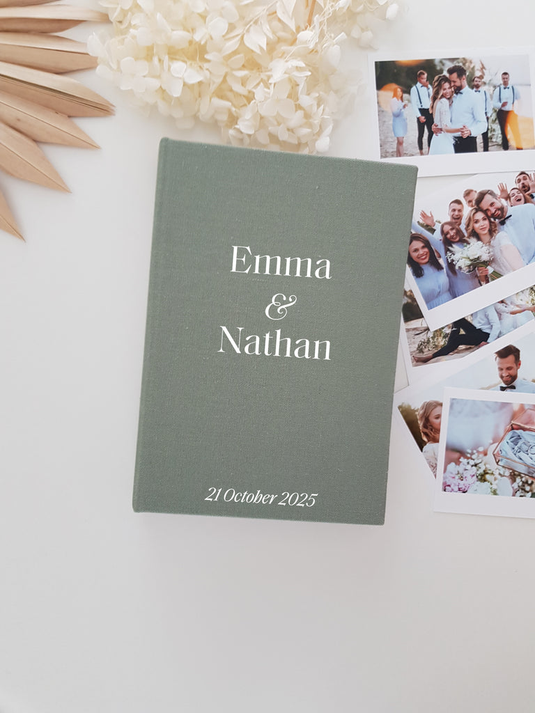 Please provide your names, date (with desired formatting) and wording on the spine in the personalisation box when you checkout.