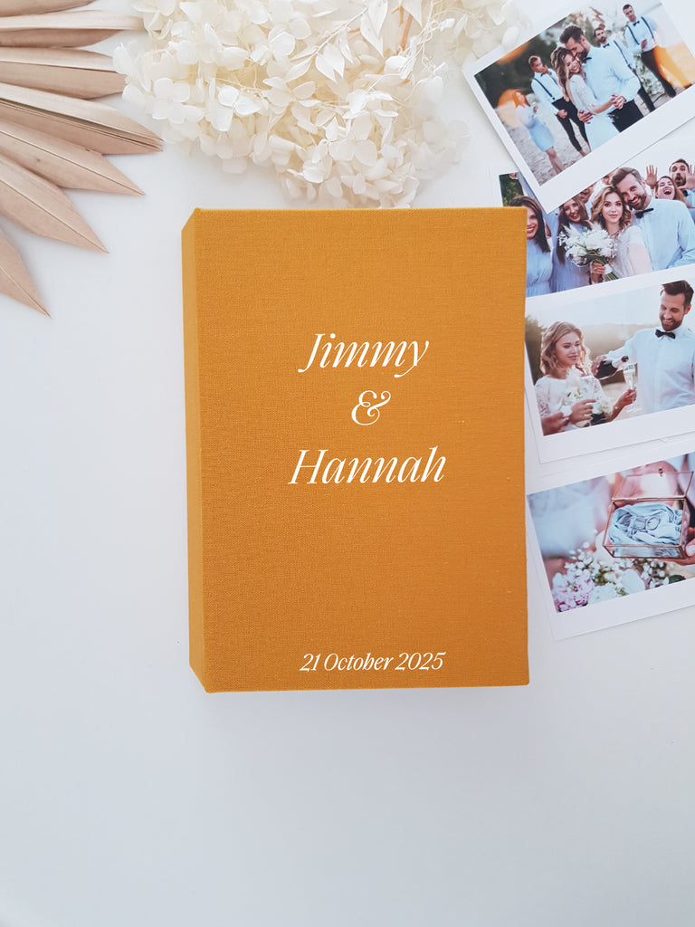 - Linen hardcover with customisable design - we use a cut to cover method which is then permanently heat pressed onto the linen